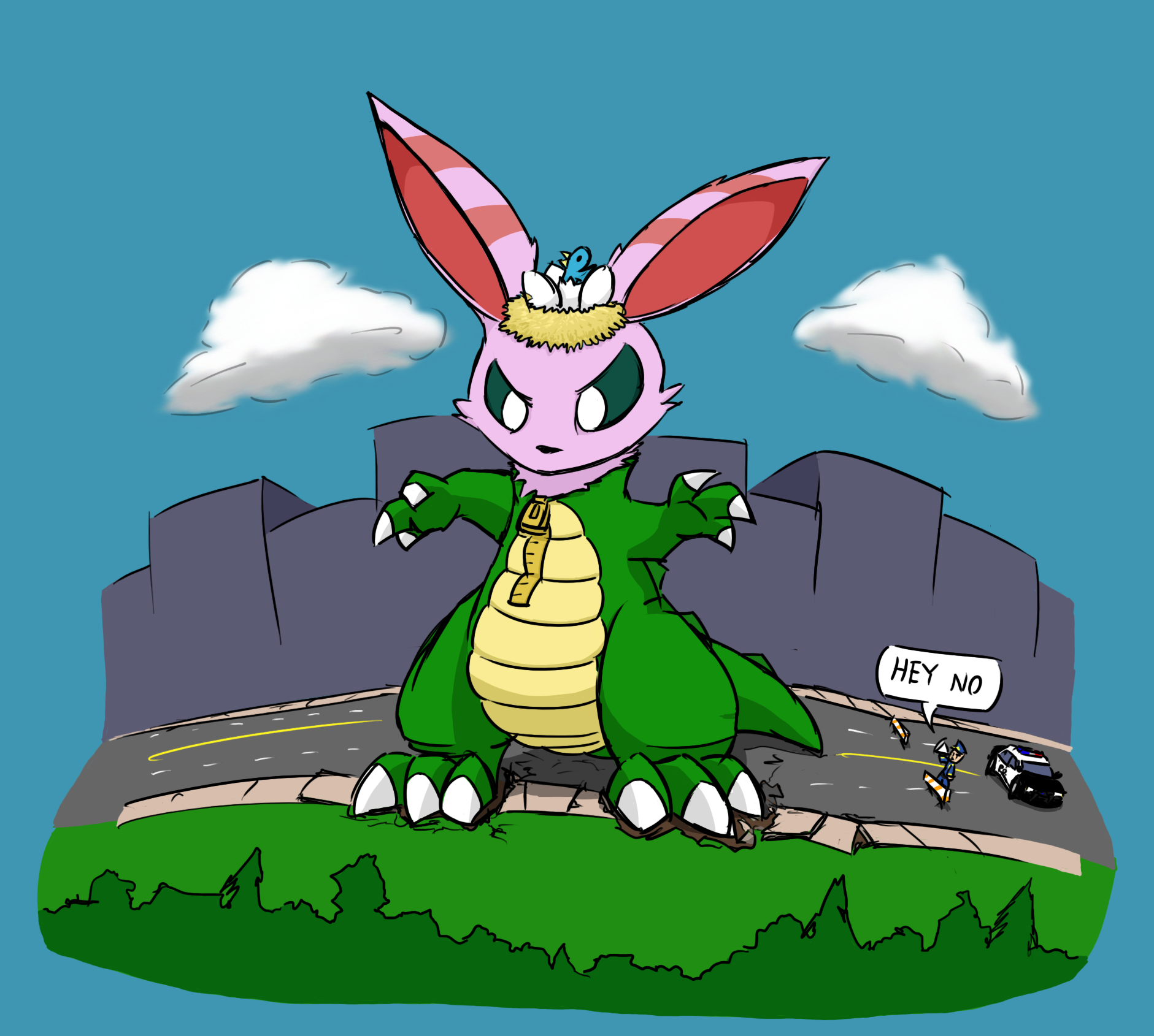 So, giant stripe-eared bunny in a dino costume with a bird's nest hat.