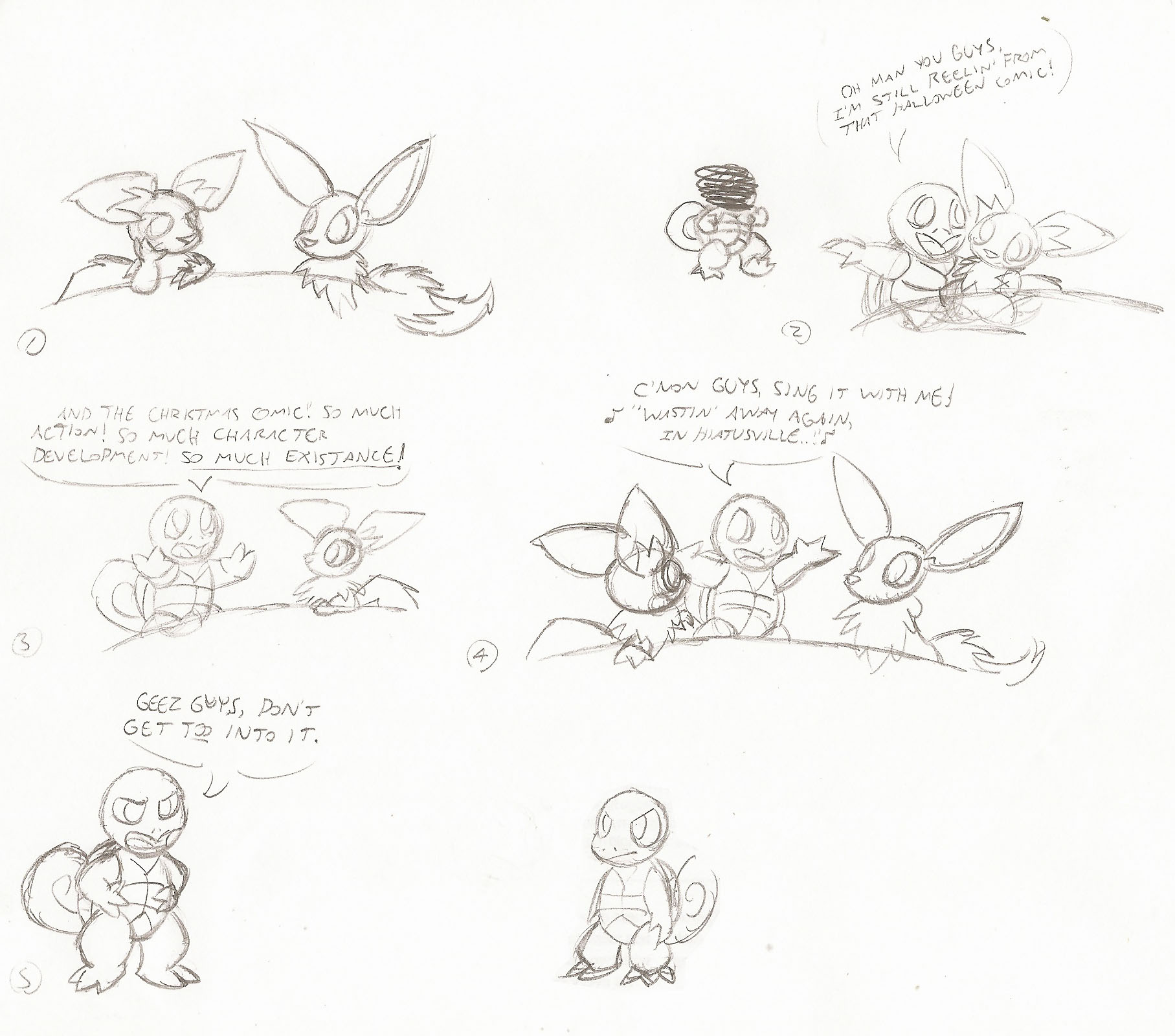 This was going to be made into a comic making fun of the lack of comics. Predictably, it was never finished.I kept it around, because it is so rare that I can draw this many decent squirtles at once.