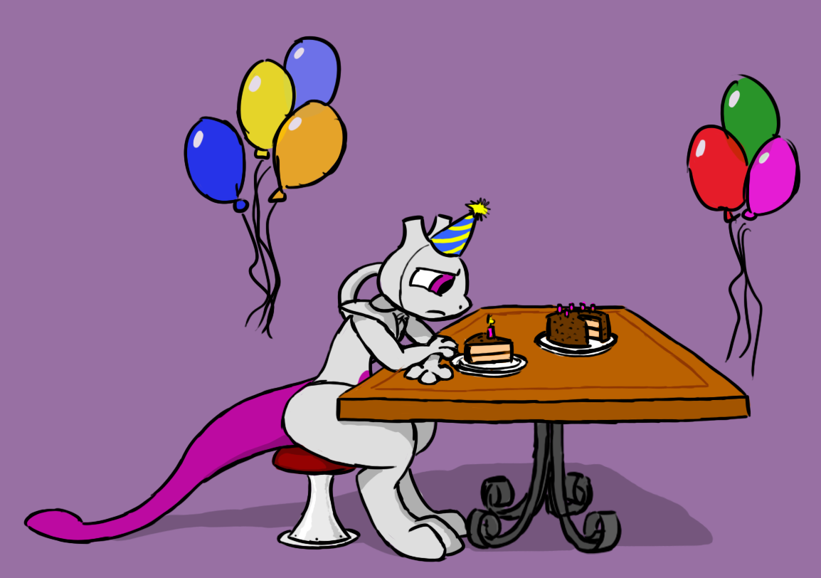 I drew this on February 7th after finding out that Mewtwo has a canonical birth date-- February 6th. My bad.That table is based on one my family used to own. The stool is not based off of anything.